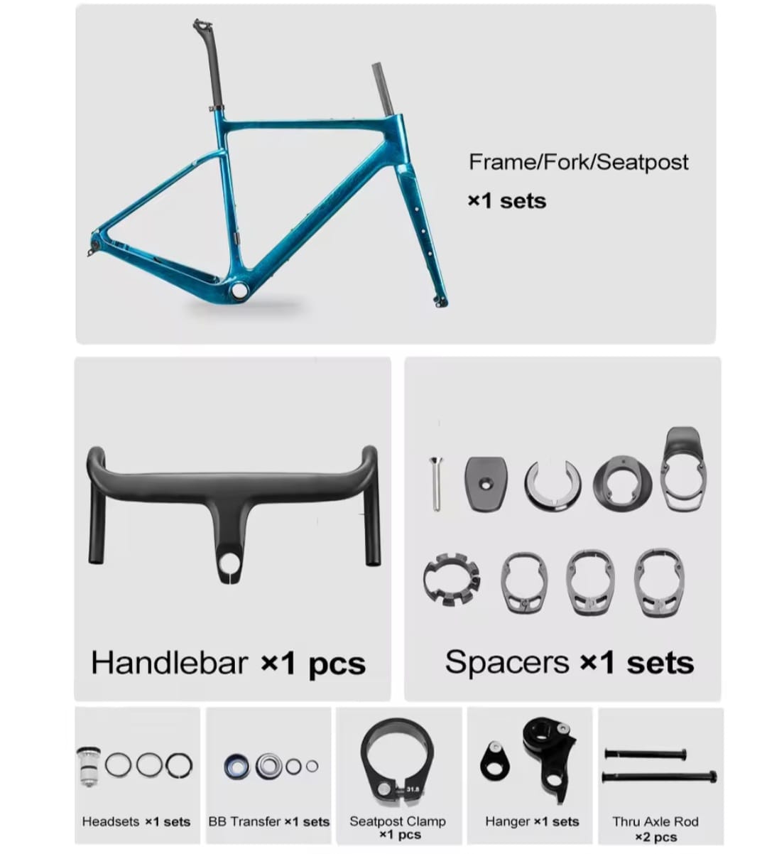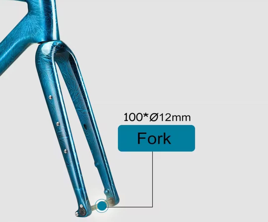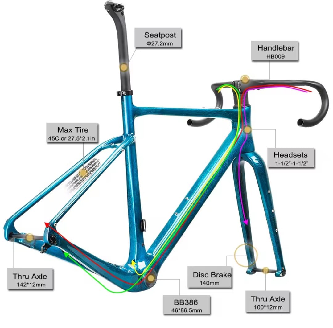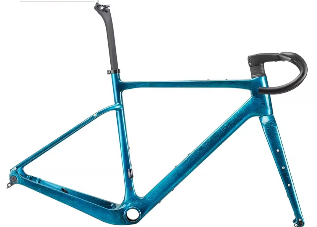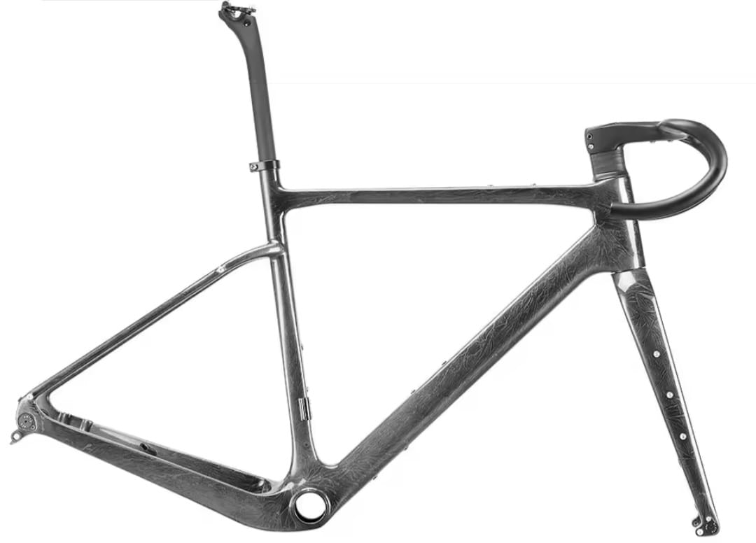Cuadro full carbon con geometría gravel/endurance, diseñada para ofrecer el equilibrio perfecto entre comodidad en largas rutas y respuesta deportiva en los tramos más exigentes.
